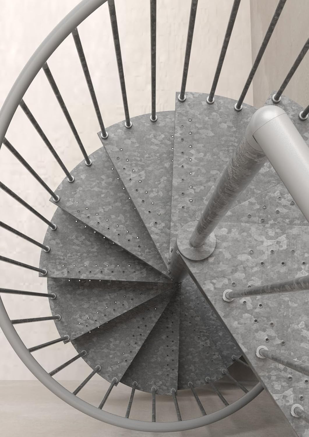 Spindeltrappe i galvaniseret stål med ståltrin til udendørs brug. Spindeltrappe i galvaniseret stål er stærk og nem at samle. Spindeltrappen kan tilpasses til ethvert miljø takket være den universelle repose, der kan anvendes til enhver type hul eller mezzanin.