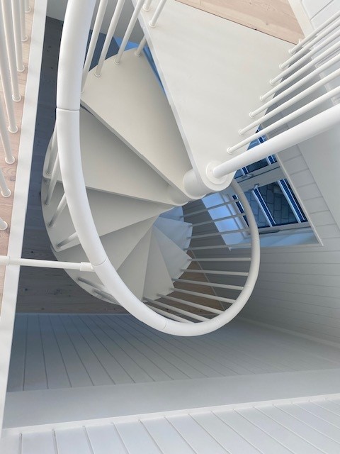 Behandling af metal. Ovn malet med epoxy pulver i grundfarverne. Ved typen spindeltrappe dopera hvid leveres afstandsstykkerne i farven hvid.