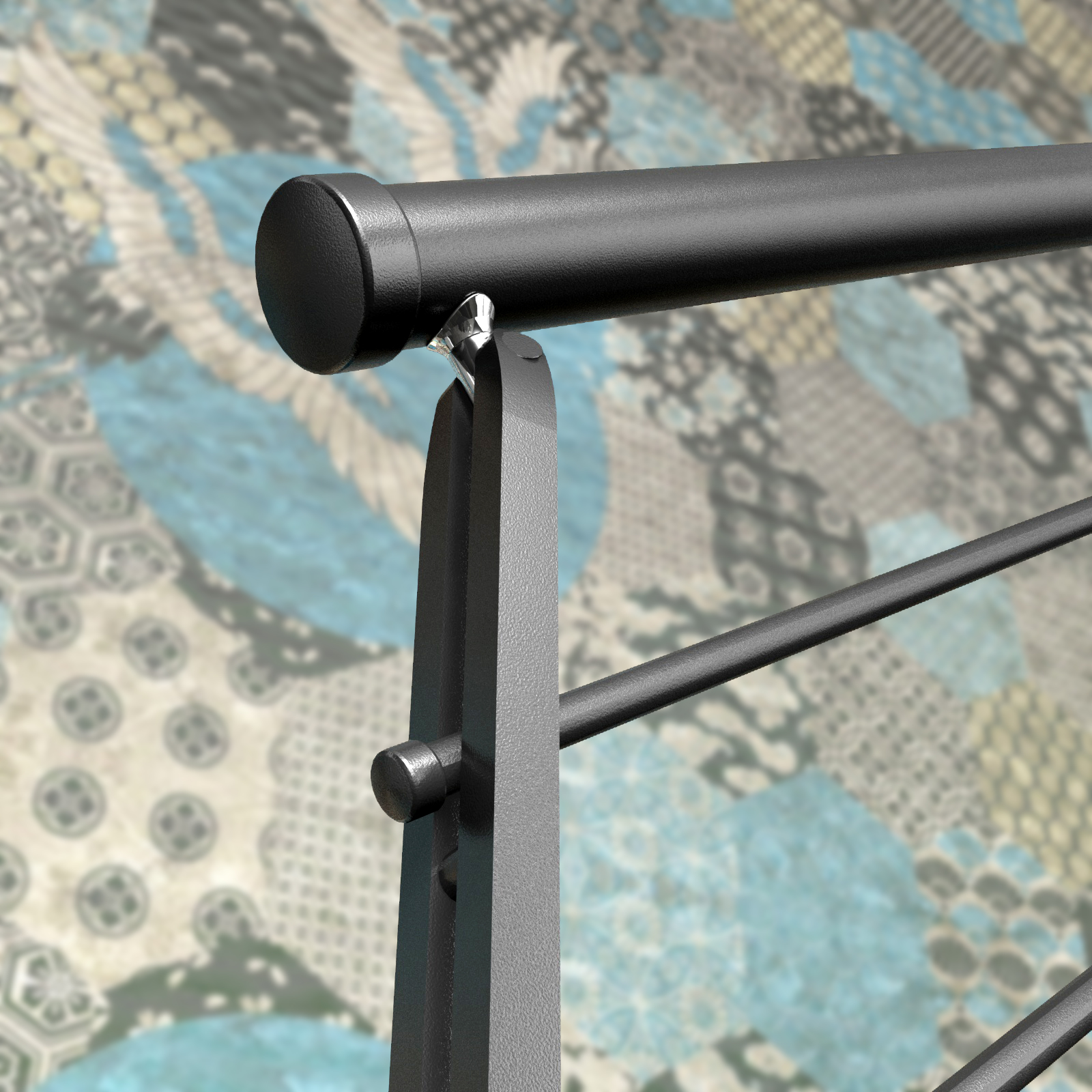 Håndliste er fremstillet i stål med fittings i plastik materiale i samme farve som vanger.